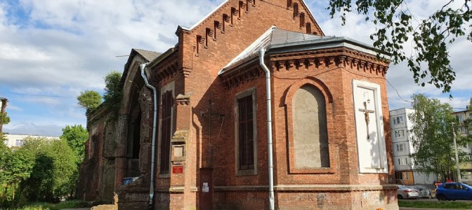 Прекрасное здание кирхи служило высотной доминантой города и играло важную градообразующую роль. Ограда сада и ажурные окна с простенками коричневого цвета украшали растущие розы.