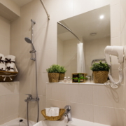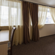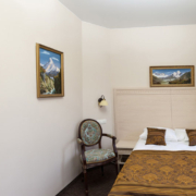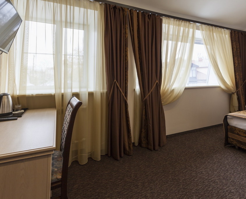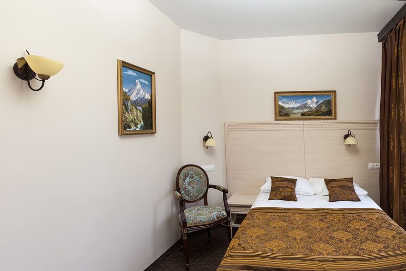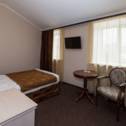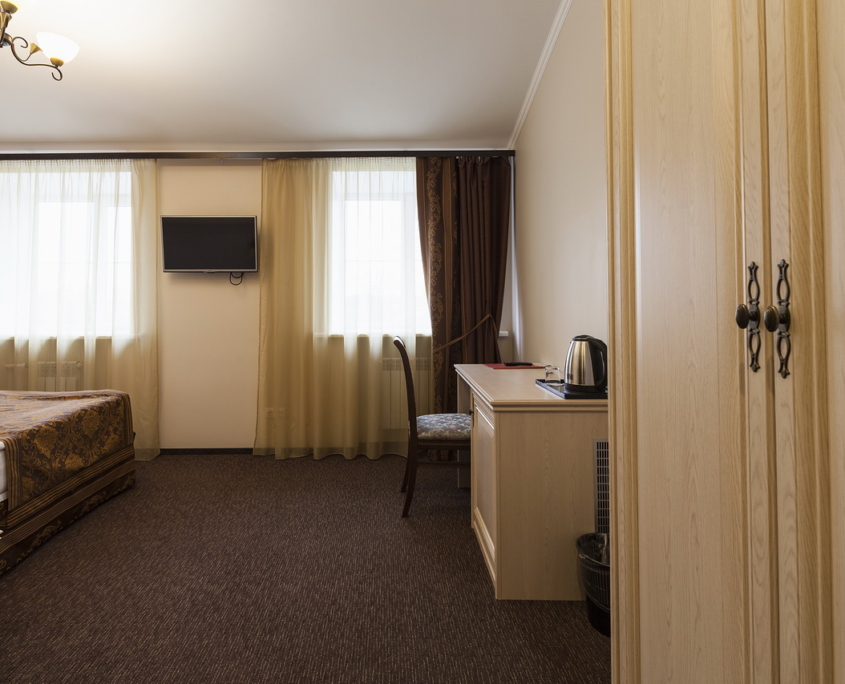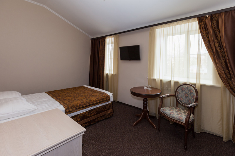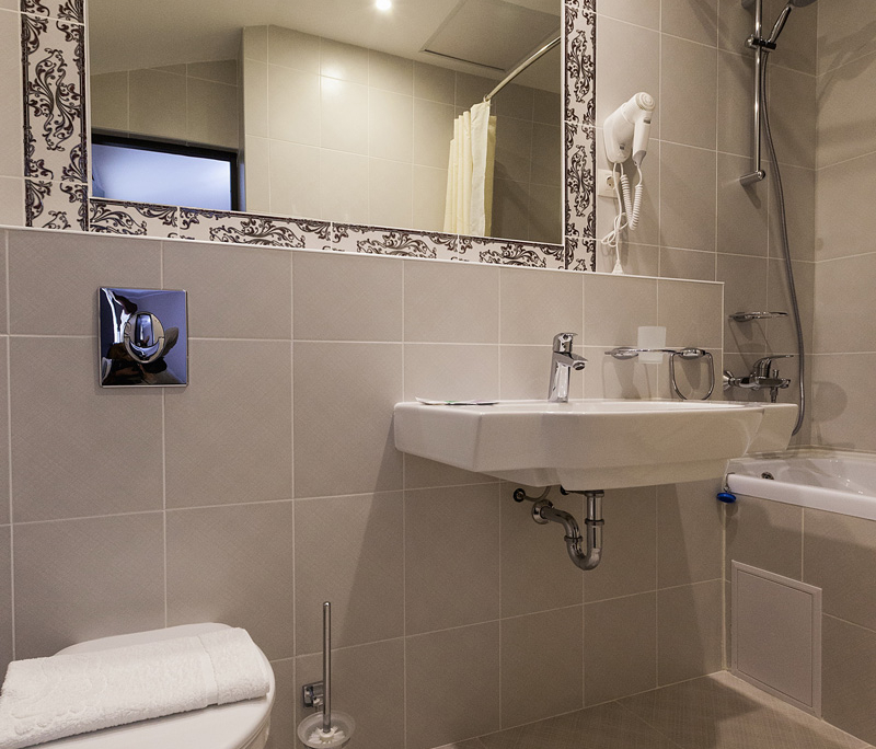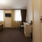 Номер в гостинице в Гатчине оформлен в классическом стиле. Есть ковролин. Санузел: душ или ванная, фен, косметические средства.